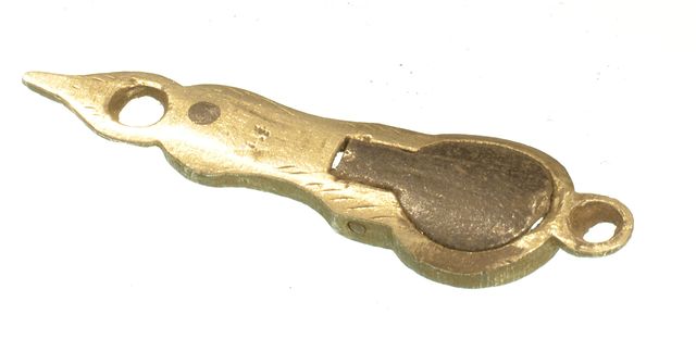 PERCUSSION CAP COVER & TRAP, Inlets to stock. Most likely from an old plains type rifle. Pewter frame, iron trapdoor.