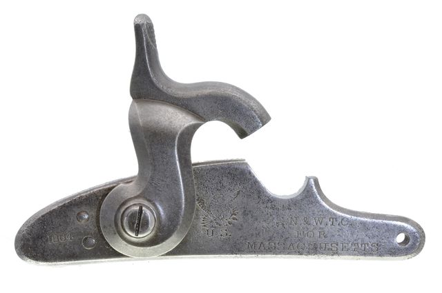 MODEL 1863-1864 SPRINGFIELD LOCK, Marked with Eagle over "U.S. S.N. & W.T.C. / FOR / MASSACHUSETTS". 1864 Dated. Complete & Functional, Original.