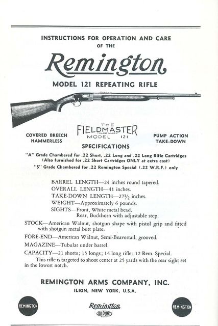 REMINGTON MODEL 121 REPEATING RIFLE .22 CAL (PUMP), Reprint of the instruction manuals packed with Remington rifles and shotguns. Contains photo illustrated parts breakdowns and identification along with complete specification of the arm. Assembly and disassembly instructions as well as operation and care are detailed. Sights and ammunition are also covered.