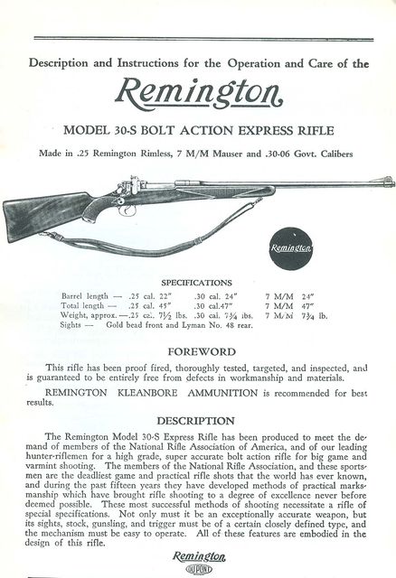 REMINGTON MODEL 30-S REPEATING RIFLE .25, 7MM, .30-06 CAL. (BOLT), Reprint of the instruction manuals packed with Remington rifles and shotguns. Contains photo illustrated parts breakdowns and identification along with complete specification of the arm. Assembly and disassembly instructions as well as operation and care are detailed. Sights and ammunition are also covered.