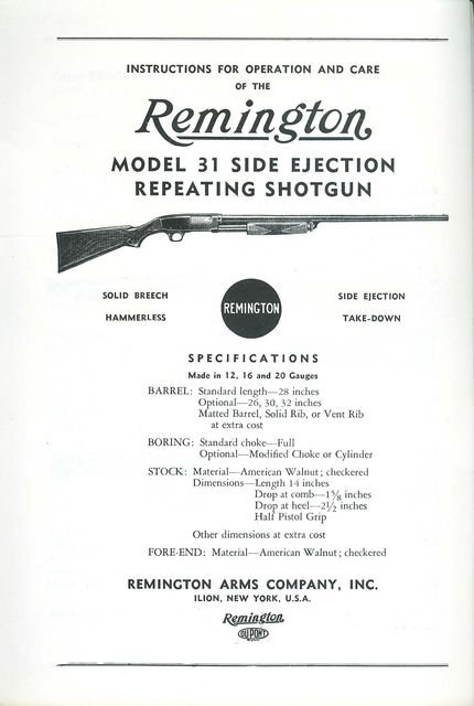 REMINGTON MODEL 31 REPEATING SHOTGUN 12, 16, 20 GAUGE (PUMP), Reprint of the instruction manuals packed with Remington rifles and shotguns. Contains photo illustrated parts breakdowns and identification along with complete specification of the arm. Assembly and disassembly instructions as well as operation and care are detailed. Sights and ammunition are also covered.