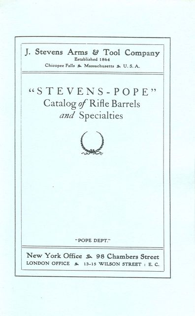 J. STEVENS ARMS & TOOL CO., 1901 STEVENS-POPE Catalog of Rifle Barrels and Specialties "Pope Dept", 5 1/2" x 8 1/2", 32 pages, soft cover. Illustrates and describes the barrels, false muzzles, bullet starters, ramrods, bullet molds, lubricating pumps, wind gauge sights, loading flasks and palm rests endorsed by Harry Pope while in the employ of Stevens. Great detail is given to advertise the accuracy of barrels and complete target rifles ordered thru the "Pope Dept". Full line of Stevens-Pope rifles are shown along with detailed specs. Reprint