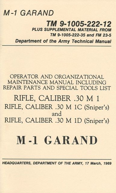 M1 GARAND TM9-1005-222-12 MODELS .30M1, .30M1C, .30M1D. Dept of Army 1969, 64 pages, 5½”x 8½”