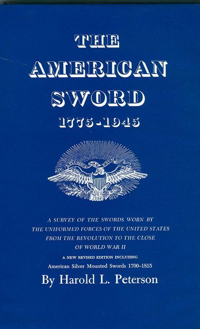 THE AMERICAN SWORD 1775-1945 by Harold Peterson. 286 pages with over 200 illustrations. Included in the book is an additional 60 page selection "American Silver Mounted Swords 1700-1815". This book is actually two works combined into one definitive research book. Lists makers and their marks. Chapters on Special presentation swords, officers swords, enlisted mans swords along with dimensions and descriptions. This is the standard reference on this interesting subject. Hardcover.