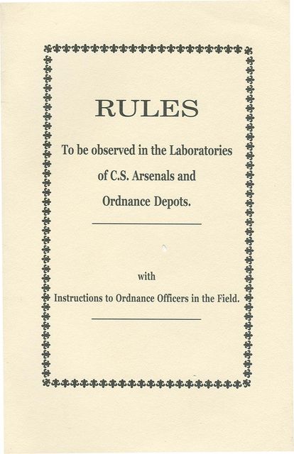 RULES TO BE OBSERVED IN THE LABORATORIES OF C.S. ARSENALS AND ORDNANCE DEPOTS 48 pgs. Sections on instructions to officers, preservation of ammunition, instructions for loading the cartridges and duties of Ordnance Sergeants. Letters from Ordnance Officers regarding cartridges, powder and ball. Interesting reading of information not previously published.