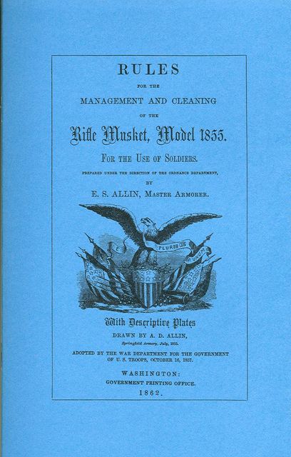 RULES FOR MANAGEMENT AND CLEANING RIFLE MUSKET MODEL 1855. G.P.O 1862. 31 pages of line drawings of parts and accessories, and text on procedures for dismounting, cleaning and reassembly. Has instructions for inserting the roll of primer tape into the lock