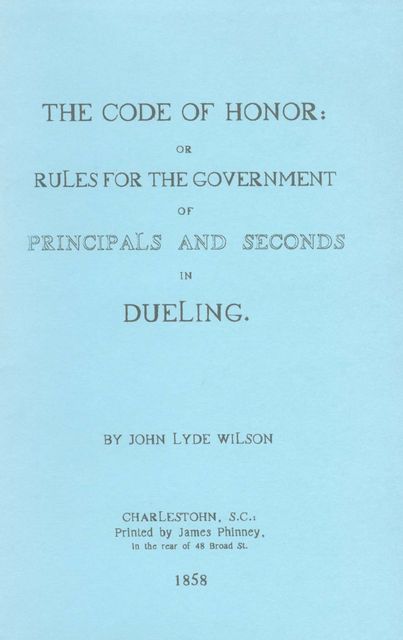 THE CODE OF HONOR OR RULES FOR THE GOVERNMENT OF PRINCIPALS AND SECONDS IN DUELING. by J.L. Walson. 16 pages, 5 1/2" x 8 1/2", soft cover. Reprint of rare 1858 document. Details duty of person insulted, seconds, the challenge arms and loadings, presenting, the degree of insult, etc