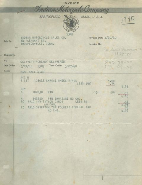 INDIAN MOTOCYCLE DEALER INVOICES. Original 1930's -'40's factory to dealer invoices. Listed on the invoices are various parts, tools, accessories and repairs with prices. We purchased these from the family of the Indian Motocycle dealership. Many of our customers have found these invaluable as a reference while restoring their motorcycles. These fit perfectly into an 8 1/2" x 11" frame and Will make an interesting gift for the motorcycle enthusiast. Also includes matching red printed packing slip/shipping ticket that has typed carbon copied transferred information on it This piece measures 5 1/2" x 11" and makes an interesting add on to the above invoice, Original.