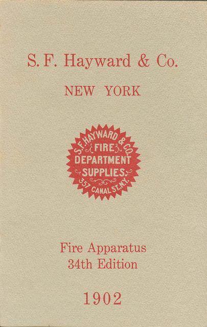 S.F. HAYWARD & CO. FIRE DEPARTMENT SUPPLY CATALOG Dated 1902. 32 pages with sketches and descriptions of wheeled fire apparatus, linen hose, rope, ladders, line throwing gun, lanterns, caps, shirts, insignia, belts, badges, trumpets, helmets. Reprint