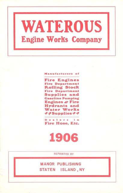WATEROUS ENGINE WORKS COMPANY CATALOG Dated 1906. 24 pages with sketches & descriptions of wheeled fire fighting apparatus, helmets, caps, belts, shirts, trumpets, badges, insignia, grenades & fire extinguishers, lanterns, gongs, rasher coats, boots and hats, pipes, nozzles, tools, & hose racks. Reprint