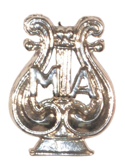 CIRCA 1950 WEST POINT BAND COLLAR INSIGNIA. Lyre With M.A. Overlay. Nickle Finish, Clutch Back Fasteners, Reproduction.