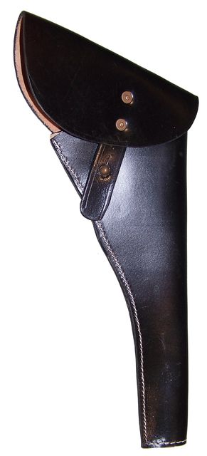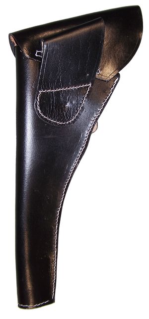 CW PATTERN HOLSTER. Black Leather With Flap Secured With Strap. Sewn Bottom Plug. Fits .36 or .44 Revolvers With 8" Barrel Or Shorter. Holster On Your Left Side, Butt Facing Front, Reproduction.
