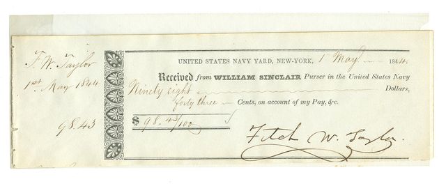 U.S. NAVY PAY VOUCHER, DATES 1840's. Various names and signatures. From U.S. Navy Yard, N.Y. Signature of naval officer as receipt of pay, Original.
