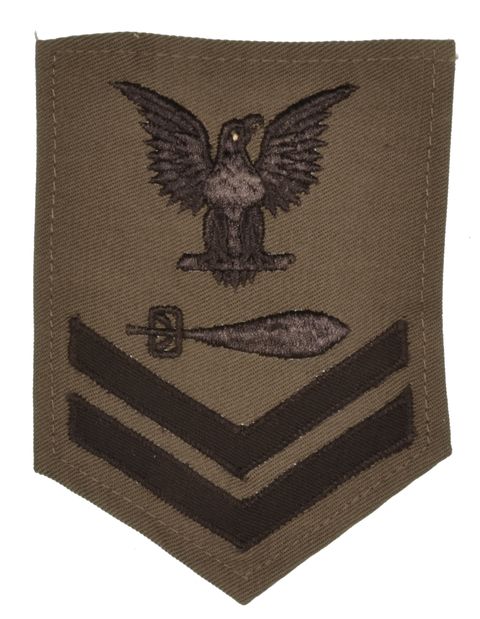 TORPEDOMAN, 2nd CLASS. Eagle with torpedo & 2 stripes. Dark gray twill with stripes & specialty mark embroidered in dark blue. WW2 dates hand stitched on reverse side. Mint, Original.