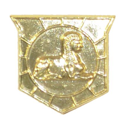 WW2 MILITARY INTELLIGENCE COLLAR DEVICE. Shield w/ Sphinx In Circle w/Rays To Shield's Edge. Marked "Amcraft Acid Test", Original Unfinished Stampings To Which Clutch Backs And Gilt Finish Have Been Applied. Extremely Rare, Original.