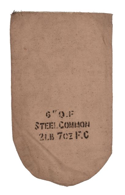 CIRCA 1898 WHITE SILK CANNON POWDER BAG. 6" x 10 1/2", Rounded Bottom. Stencilled "6 Q.F., Steel, Common, 2lbs.7oz, F.G.", Original.