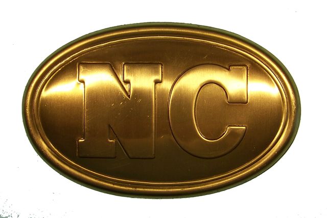 NORTH CAROLINA CARTRIDGE BOX PLATE (NC). Die Stamped Brass, 2 Loops For Cartridge Box Flap. Lead Filled, Reproduction.