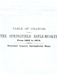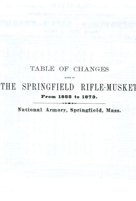 TABLE OF CHANGES MADE IN THE SPRINGFIELD RIFLE MUSKET FROM 1855 TO 1873. National Armory 1873. 8" x 10". Shows interchangeability of 82 separate parts with 13 different model guns. Interesting notes on M1861 Special. Valuable reference for the collector and gunsmith