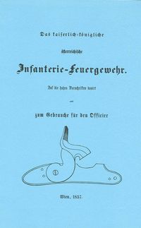 OSTERRICHISCHE INFANTERIE - FEUERGEWEHR, WIEN 1857. 72 pages, 5 1/2" x 8 1/2", soft cover. This official Austrian Government manual on the Percussion Military Musket completely describes and illustrates with line drawings all component parts, appendages, ammunition, tools and bayonet. Detailed procedure for loading, cleaning, assembly and disassembly. Charts show ballistic data and effective use against troops. Imported in large quantities, this musket (Austrian Lorenz) was used by both North and South during the Civil War. Printed in the German language. Reprint