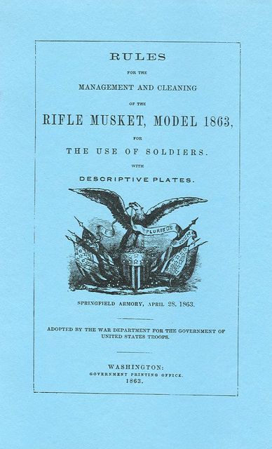 RULES FOR THE MANAGEMENT AND CLEANING OF THE RIFLE MUSKET, MODEL 1863. 5 1/2" x 8 1/2", 24 pages, soft cover, reprint. Contains the full instructions for use, assembly and disassembly, illustrating all component parts and appendages