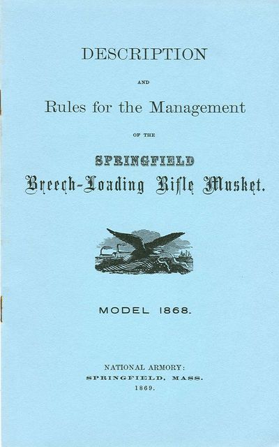 DESCRIPTION AND RULES FOR THE MANAGEMENT OF THE SPRINGFIELD BREECH-LOADING RIFLE MUSKET, MODEL 1868. National Armory, Springfield, Mass. 1869. 5 1/2" x 8 1/2", 20 pages, soft cover, illustrated with line drawings of breech mechanism, parts. Describes disassembly and assembly, procedures, cartridge data, directions for use, tables of trajectory, etc