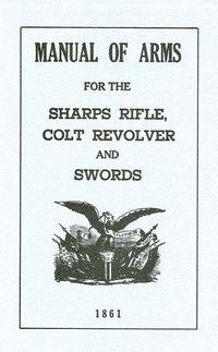 MANUAL OF ARMS FOR THE SHARPS RIFLE, COLT REVOLVER AND SWORDS. 1861 Reprint, 5 1/2" x 8 1/2", 28 pages, soft cover. Compiled from Volunteers Manual #1 by Worthington. Step by step handling of arms for both foot and mounted troops
