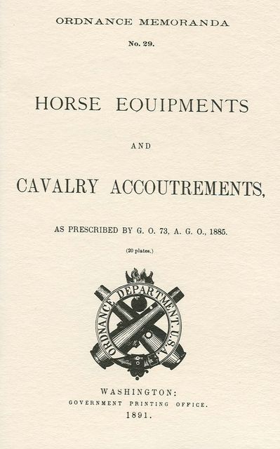 ORDNANCE MEMORANDA No. 29 - HORSE EQUIPMENTS AND CAVALRY ACCOUTREMENTS. Ordnance Department, Wash., D.C. 1891. 48 pages, 5 1/2" x 8 1/2", soft cover. A fine quality reproduction of this rare ordnance report that established the new Model 1885 equipment for the U.S. Cavalry. Illustrated with 20 engraved plates depicting saddles, saddle bags, stirrups, bridles, other horse equipment, horse covers, saddle blankets, saddle cloths, etc, all with actual dimensions for all components. The text describes the equipment and material of which it is made as well as further details of dimensions. This work has a wealth of information for all Calvary collectors and students. A must for all of those who are interested in U.S. cavalry equipment and accoutrements of the Indian War period.