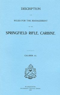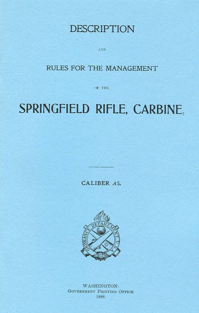DESCRIPTION & RULES FOR THE MANAGEMENT OF THE SPRINGFIELD RIFLE, CARBINE, CALIBRE .45. GPO 1898. 6" x 9", soft cover, 48 pgs, 77 line drawings of the rifle, carbine, officer's model rifle, component parts, sights & accessories. Describes disassembly, assembly, maintenance, repair
