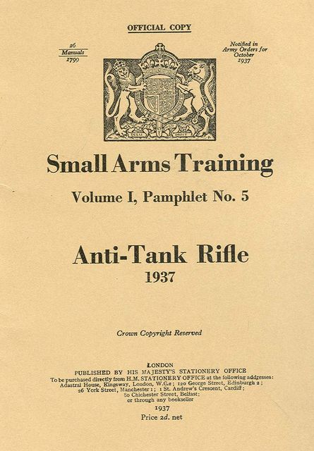 ANTI-TANK RIFLE, 1937, SMALL ARMS TRAINING, VOLUME 1, PAMPHLET NO. 5. Published by His Majesty's Stationery Office. 5" x 7", 16 pages, soft cover. Illustrated. Official training manual for the anti-tank rifle. Contains description, operation, stripping and cleaning, loading and unloading, setting sights and arming, holding and firing and safe handling. Original issued manual dated 1937