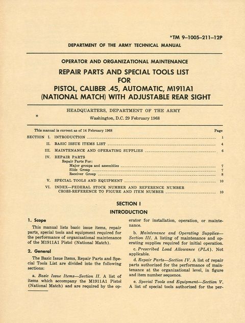 DEPARTMENT OF THE ARMY TECHNICAL MANUAL TM9-1005-211-12P OPERATOR AND ORGANIZATIONAL MAINTENANCE, REPAIR PARTS AND SPECIAL TOOLS LIST FOR PISTOL, CALIBER .45 AUTOMATIC, M1911A1 (NATIONAL MATCH) WITH ADJUSTABLE REAR SIGHT. HQ DEPT OF ARMY 1968. 8" x 11", 14 pages, illustrated, soft cover. Reprint describes maintenance and operating supplies, repair parts, special tools and equipment