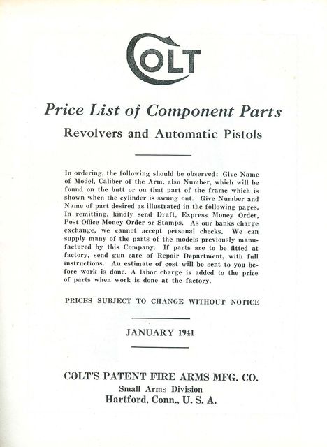 COLT PRICE LIST OF COMPONENT PARTS FOR REVOLVERS & AUTOMATIC PISTOLS, JANUARY 1941
