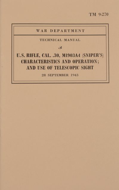 U.S. RIFLE, CAL. .30, M1903A4 (SNIPER'S) CHARACTERISTICS AND USE OF TELESCOPIC SIGHT by the War Department. 30 pages with black and white images. Reprint of the 1943 manual. Discusses the differences between the standard 1903 service rifle and the A4 Sniper model as well as use, care and maintenance of the rifle and scopes. Reprint of TM 9-270.