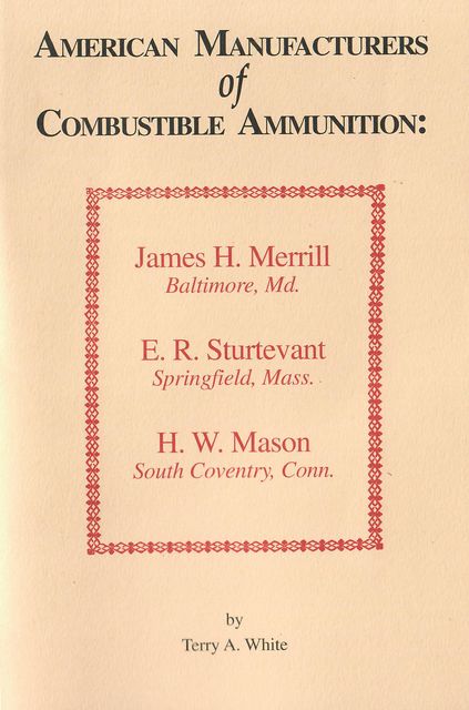 AMERICAN MANUFACTUERS OF COMBUSTIBLE AMMUNITION By Terry A White. 112 pages with black and white images. Details the history of 3 prominent ammunition manufactures in the U.S.: James H Merrill of Baltimore, MD; E.R. Sturtevant of Springfield, MA; and H.W. Mason of South Coventry, CT. Contains hours of painstaking research and much information that was believed to have been lost. A must for any serious cartridge collector.