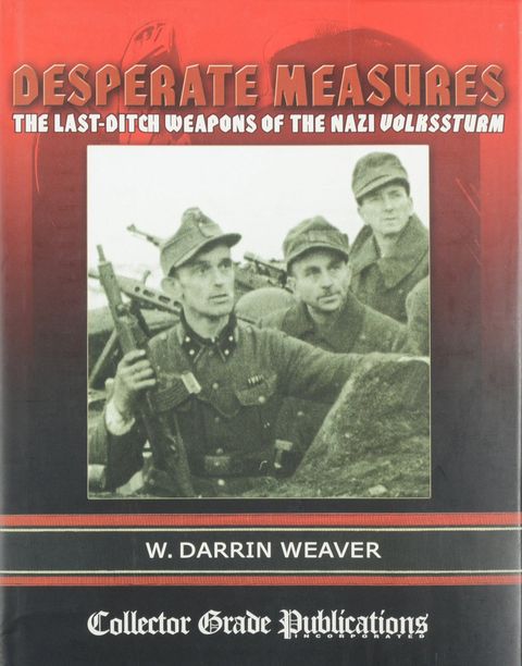 DESPERATE MEASURES by W. Darrin Weaver. Hardcover, 424 pages with black and white images. The first in-depth study of the amazing series of events which took place during the last chaotic months of Adolf Hitler's "Thousand Year Reich". The war was already lost for Germany before the idea of a "People's Army" gained any sanction. The six million old men and boys of the Volkssturm were initially equipped with shotguns, drillings, hunting rifles, military training rifles and handguns scrounged from the German populace. These few arms were bolstered by foreign rifles and carbines captured during Germany's early wartime advances, and many collectors and historians may be surprised to learn that the rifle issued in the greatest numbers-the "true Volksgewehr"-was the Italian Carcano, some numbers of which were converted to fire the powerful German 7.92x57mm rifle cartridge! In addition, seven types of Volksgewehre were specifically designed for manufacture by German industry during the last months of the war. All are covered in detail, and the book includes many previously unpublished photographs of original Volkssturm weapons, including prototypes and rare presentation examples. Other Volkssturm weapons included the anti-tank Panzerfaust ("tank fist"), a single-shot, rocket-propelled shaped-charge device capable of defeating any Allied tank then in existence, and numerous "clones" of the British Sten machine carbine, which were hastily manufactured by a considerable number of German firms (a memorandum speaks of "30 subcontractors and 14 assembly points"). Programs were also begun to develop special Volkspistolen, made largely from stamped sheet metal. In summing up, the author notes that even if the Volkssturm had been fully trained, well equipped and armed with the best weapons in the world-which they decidedly were not-they could have done no more than delay the inevitable, which in many cases, documented here, they actually did.