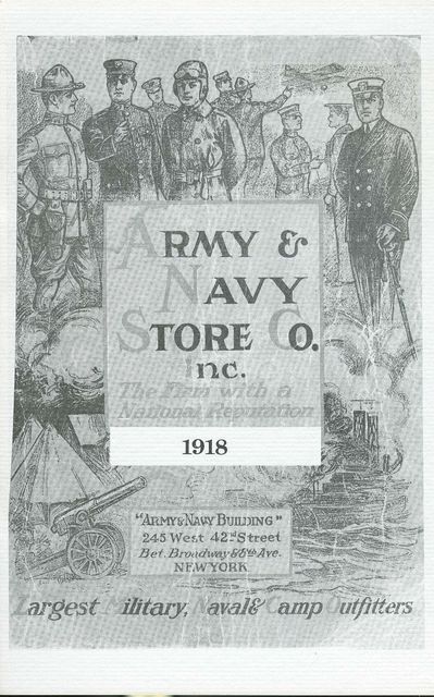 ARMY AND NAVY STORE CO. INC, CATALOG 1918 EDITION, 32 pages soft cover. Comprehensive illustrated listing of WWI Army and Navy, USMC, Coast Guard, US PHS equipment for both enlisted men and officers. Details and illustrates wings, chevrons, cloth rating badges, collar discs, insignia, buttons, shoulder boards, sabre knots, sword belts, web gear, headgear, dress and fatigue uniforms and much more. Contains very interesting items