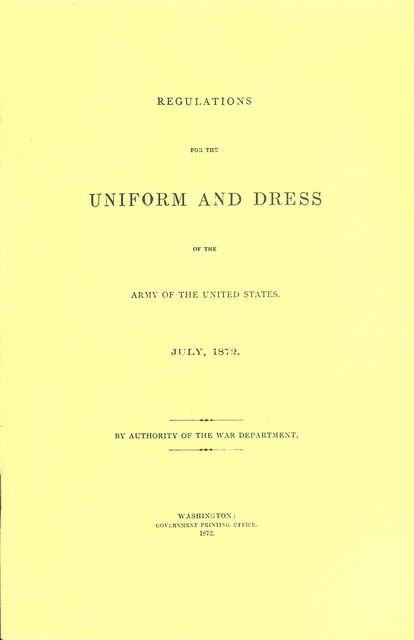 REGULATIONS FOR THE UNIFORMS AND DRESS OF THE ARMY OF THE UNITED STATES 1872 Govt. printing Office 1872. 20 pages, 5 1/2" x 8 1/2", soft cover. Contains full regulations for the uniforms, insignia and accoutrements as worn by different branches of the Army. Both officers and enlisted men. Includes horse furniture & military academy uniforms. Reprint of early Indian War Regs.