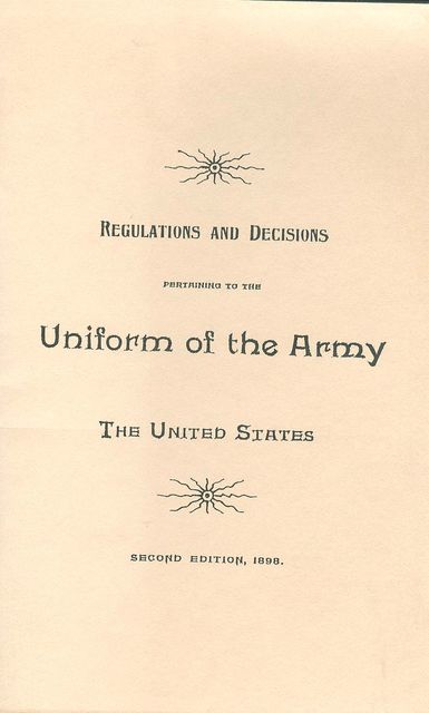 REGULATIONS AND DECISIONS PERTAINING TO THE UNIFORM OF THE ARMY OF THE UNITED STATES, 1898 Govt. printing office, Washington, Second Edition, June 20, 1898. 48 pages, 5" x 7 1/2", soft cover, indexed. Contains full regulations for uniforms, insignia and accoutrements for both officers and enlisted men as worn by different branches of the Army. Interesting section on summer clothing, canvas fatigues and the uniform for enlisted Indian Scouts. Also included are specifications for horse equipment. Reprint of official govt. regulations