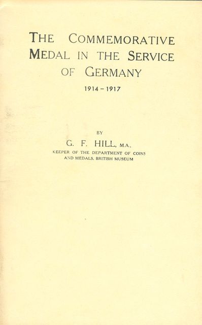 THE COMMEMORATIVE MEDAL IN THE SERVICE OF GERMANY 1914-1917. by G.F. Hill, M.A., Dept of Coins and Medals, British Museum. 24 pages, 5" x 8", soft cover. Reprint of the WWI study of Imperial German propaganda medals. Includes Zeppelin Raid on London, Victory Penny, To Paris 1914, Bismarck Medal and the Sinking of the Lusitania. Ill. with 16 types showing both sides as well as text.
