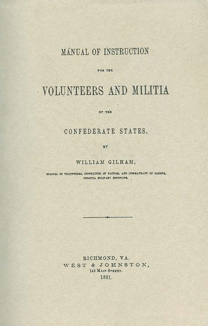 MANUAL OF INSTRUCTION FOR THE VOLUNTEER & MILITIA OF THE CONFEDERATE STATES, by William Gilham, Originally printed in 1861 and published by West & Johnston in Richmond, VA. Gilham was a Commandant and Instructor at Virginia Military Institute