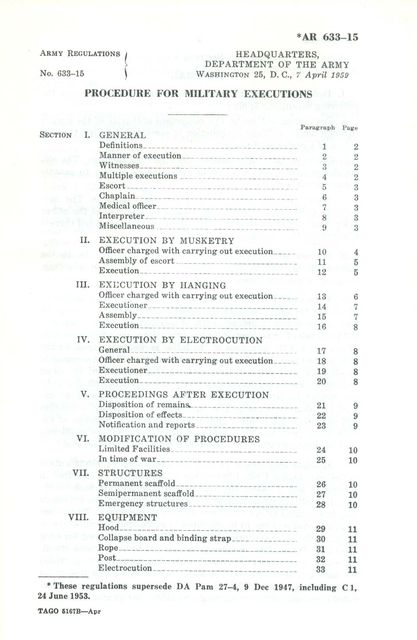 PROCEDURE FOR MILITARY EXECUTIONS (ARMY REGULATIONS #633-15) DEPARTMENT OF THE ARMY 1959. 22 pages, 5 1/2" x 8 1/2", soft cover, reprint. Official U.S. Army handbook describing methods of execution - musketry, hanging and electrocution. Illustrations of hanging scaffolds, emergency gallows and noose. Text describes duties to be carried out by officers, executioners, etc