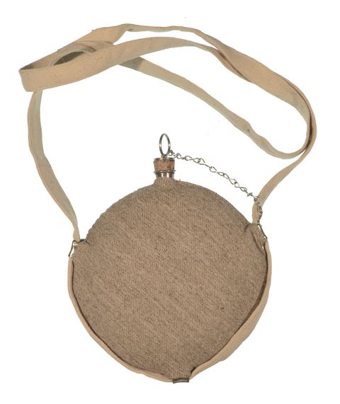 CANTEEN, Jean Cloth Covering. Copy of Civil War Issue Canteen. Complete With Cork Stopper with Retaining Chain & Cloth Carrying Strap. Stainless Steel Body, Reproduction.