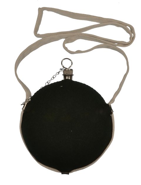CANTEEN, Green Wool Covering. Copy of Civil War Issue Canteen. Complete With Cork Stopper with Retaining Chain & Cloth Carrying Strap. Stainless Steel Body, Reproduction.
