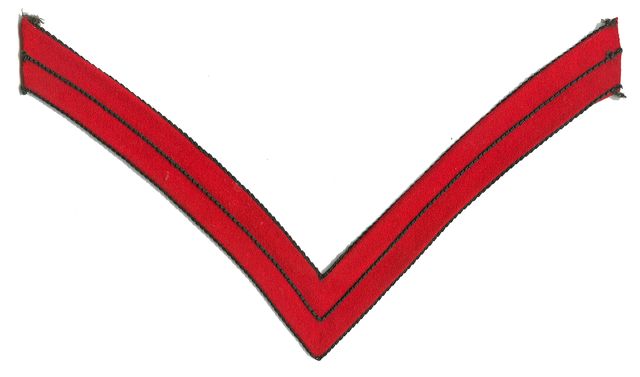 M1872 ARTILLERY CORPORAL CHEVRON. Red With Black Facing, 2 Stripes, Original. Sold in units of one (1) each.