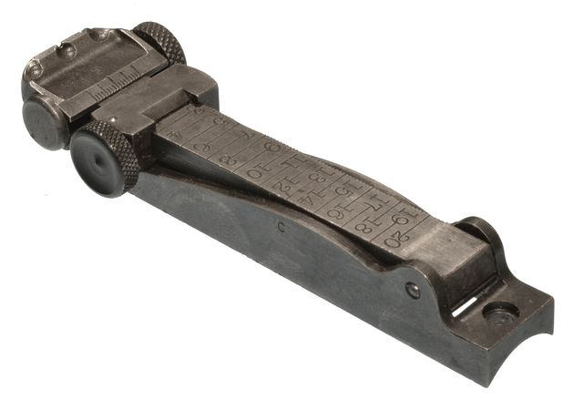 MODEL 1898 KRAG CARBINE REAR SIGHT, Model 1902, Without Tangent Peep, Complete, Replacement knob and pin. Reworked from Rifle and Stamped "C", Original.