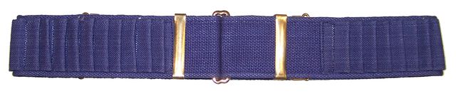 1887 MILLS WEB RIFLE BELT. Blue Color, 50 Loops, Complete With Attached Brass Ends And Flat Brass Keepers, Reproduction.