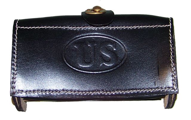 M1874 McKEEVER CARTRIDGE BOX. Black Leather with Embossed US in Oval on Flap. 20 canvas billets for .45/70 Cartridges.Has 2 Belt Loops and Brass Reinforced Flap Strap, Reproduction.