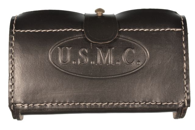USMC 6MM LEE NAVY MCKEEVER CARTRIDGE BOX. Black Leather with Embossed USMC in Oval on Flap. 4 leathe...