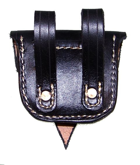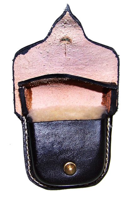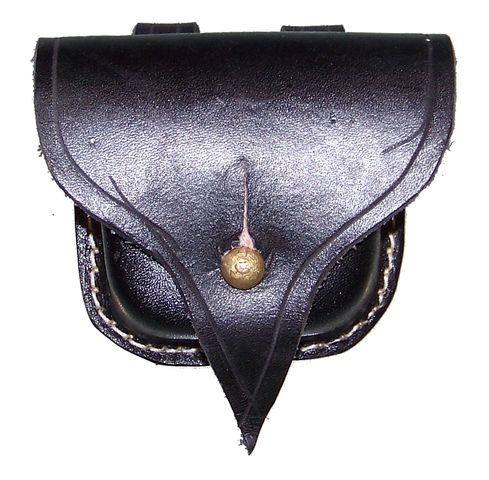 M1842 CAP BOX. Black leather, Brass finial closure on flap, Lambswool lined. Has inner flap and belt loop. For .69 caliber and .58 caliber Muskets. Regulation size, Reproduction.