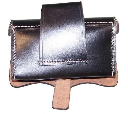 CIVIL WAR U.S. NAVY PISTOL CARTRIDGE BOX. Black Bridle leather with USN in oval embossed on outer flap. Cap pouch with cover and securing strap is mounted under top & inner flap. Has leather strap closure with brass stud, Reproduction.