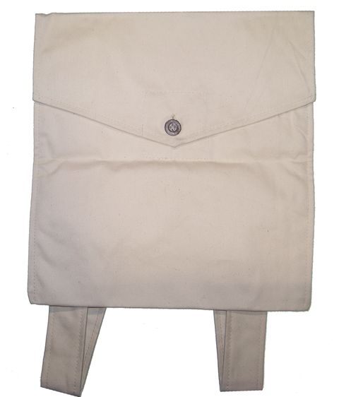 CIVIL WAR WHITE CANVAS HAVERSACK. Complete with sewn canvas carrying strap. Flap has pewter button closure. Regulation size, Reproduction.